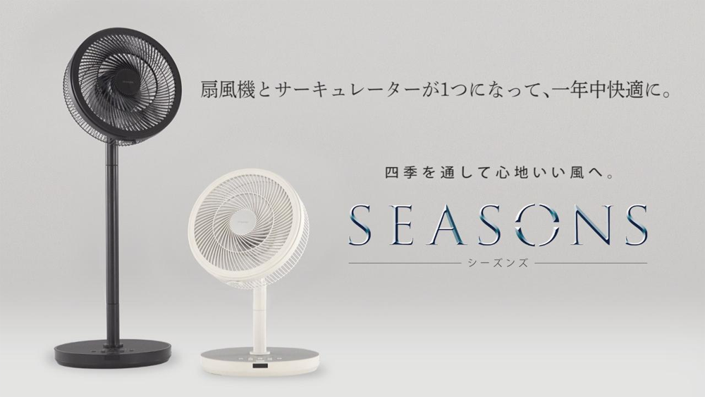 三菱電機のSEASONSは扇風機とサーキュレーターが1つになった、年中使えるアイテム。ポールの長さを2wayで変えられるようになっており、スラっと首を長くできるトールスタイルと、足元に風を送れるロースタイルに調整可能です。ロースタイルの場合は、冬場でも暖房をムラなく部屋全体に送るサーキュレーターとして使えますね。
