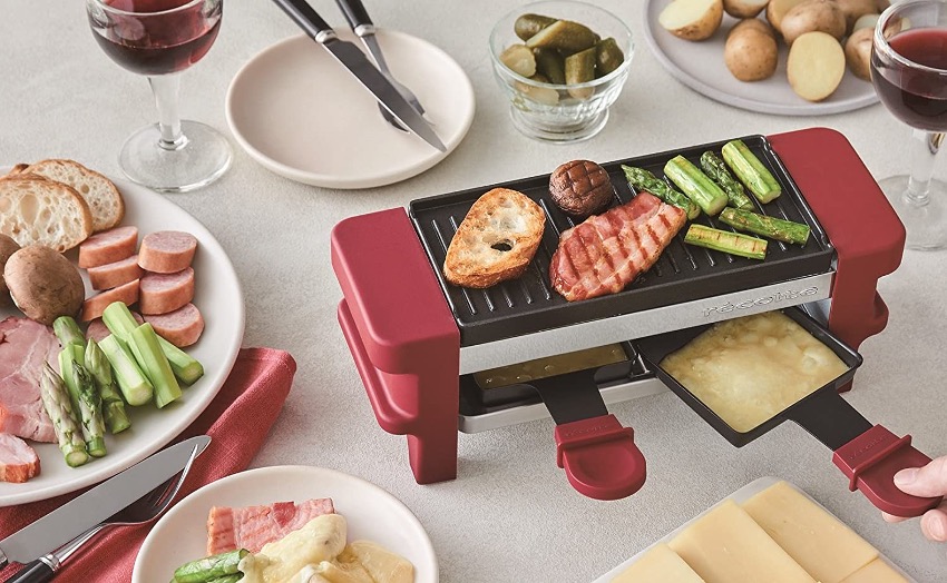 また本製品にはプレートも付属するため、肉や野菜を焼くだけの使い方でもOK。2段構成なので、上段で具材を加熱しつつ、下段でラクレットを作ってもいいでしょう。決してサイズは大きくありませんが、1〜2人で楽しむ用途や、パーティー料理を彩るプラスアルファに最適ですね。